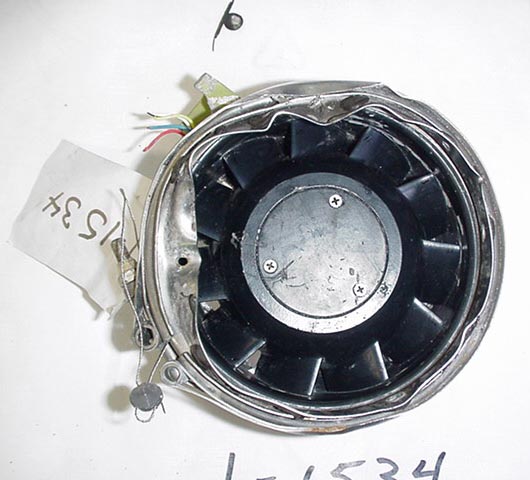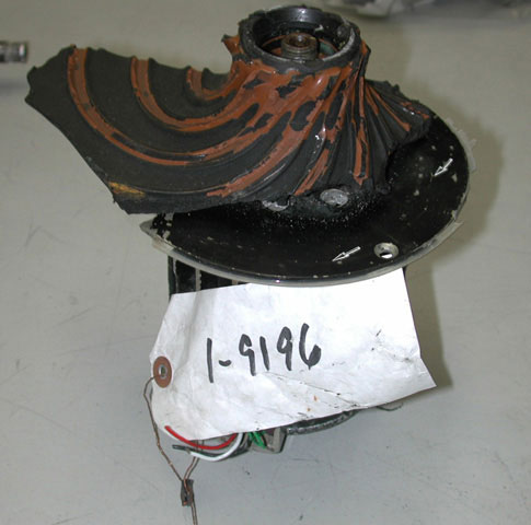 Ce ventilateur a été récupéré d'un bloc. Il a été identifié par le catalogue illustré des pièces comme portant le numéro de pièce 605457-8. Le moyeu du rouet centrifuge en composites était fixé au moteur. Les aubes du rouet, la périphérie extérieure du rouet et la bride du boîtier du moteur avaient été brisées.