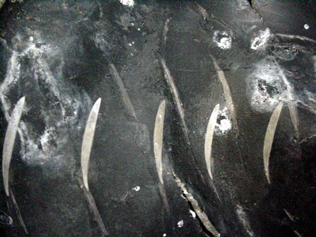 L'alignement des marques à l'extrémité des aubes laisse croire que le ventilateur ne fonctionnait pas au moment où l'extrémité des aubes a été endommagée.