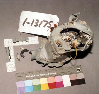 Les quatre composants récupérés, endommagés par la chaleur, ont été identifiés individuellement comme étant les pièces produites 1-5418, 1-2846, 1-8007 et 1-5460, puis ont été regroupés dans la pièce produite 1-10581 pour être intégrés à la structure reconstituée de l'avion. Aux fins d'identification, les quatre composants ont été comparés à la pièce produite 1-4929, une batterie à peu près intacte qui était installée dans le plafond suspendu arrière. Tous les numéros de pièce et les numéros de composants ont été tirés du Grimes Aerospace Component Maintenance Manual (manuel d'entretien des composants aérospatiaux de Grimes).