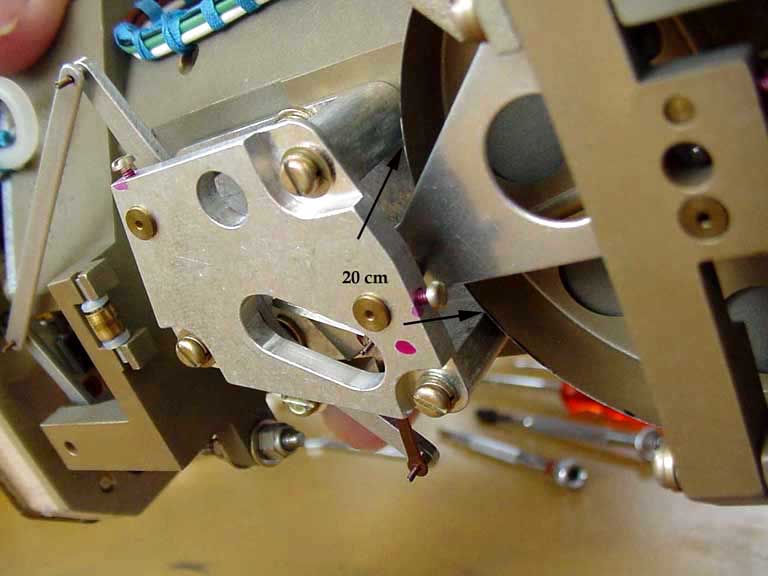En comparant la roue graduée de l'anémomètre récupérée et celle d'un anémomètre intact, on a déterminé que le cylindre passait directement devant deux montants de soutien espacés de 20 mm.