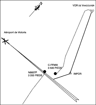 Le Piper Twin Comanche de Skys Un-Limited Air Service Limited immatriculé C-FFMW effectuait un vol d'entraînement selon les règles de vol aux instruments (IFR) en provenance de Pitt Meadows (Colombie-Britannique). À 10 h 39, heure avancée du Pacifique (HAP), l'avion a été autorisé à faire une approche directe ILS/DME (système d'approche aux instruments/équipement de mesure de distance) de la piste 27 de l'aéroport de Victoria en suivant le cheminement IMPOR STAR (arrivée normalisée en région terminale). Le Piper PA-24 Comanche N6857P était parti d'Aurora (Oregon) et se dirigeait en IFR vers l'aéroport de Victoria par le sud. Le contrôleur avait autorisé N6857P à voler à un cap de 360 degrés en prévision d'un guidage radar vers la piste 27 et à maintenir une altitude de 3 000 pieds-mer. N6857P et C-FFMW se sont rapprochés à 1,87 mille marin (nm) latéralement et à 300 pieds verticalement dans une région où l'espacement radar minimum exigé est de 3 nm ou 1 000 pieds. Pour rétablir l'espacement nécessaire, C-FFMW a été guidé vers le sud au-delà du faisceau du radiophare d'alignement de piste et N6857P a été guidé au nord de ce faisceau puis parallèlement en vue d'une approche à vue sur la piste 27.