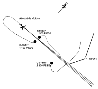 Lorsque N6857P a reçu son autorisation d'approche à vue, C-GMET, qui évoluait selon les règles de vol à vue (VFR), se trouvait alors dans le circuit à gauche de la piste 27 et était en communication avec la tour de Victoria. À 10 h 46 min 38 s, le contrôleur de la tour de Victoria a demandé à C-GMET de prolonger sa branche vent arrière gauche à cause de plusieurs appareils IFR en finale de la piste 27, et à 10 h 47 min 8 s, C-GMET s'est fait dire qu'il était troisième à l'atterrissage derrière N6857P. Quand le contrôleur d'aéroport a vu que N6857P était guidé au nord de l'approche, il a eu des doutes sur l'intention du contrôleur terminal quant à N6857P. C'est pourquoi le contrôleur d'aéroport a demandé à C-GMET de poursuivre en vent arrière et lui a dit qu'il lui indiquerait quand virer en étape de base.