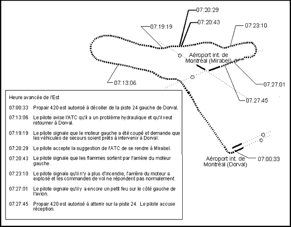 Les commandes de vol ne répondent pas normalement, en ce sens qu'il n'est pas normal qu'autant de pression soit nécessaire sur l'aileron droit pour maintenir le cap. À 7 h 19 min 19 s, l'équipage informe le contrôle de la circulation aérienne (ATC) que le moteur gauche a été coupé et, après une deuxième suggestion de l'ATC, l'équipage accepte de se diriger vers Mirabel au lieu de Dorval. Moins de 90 secondes plus tard, l'équipage informe l'ATC que des flammes s'échappent de la tuyère du moteur. On prépare l'appareil pour un atterrissage d'urgence et on revoit la procédure d'urgence pour la sortie manuelle du train d'atterrissage.
