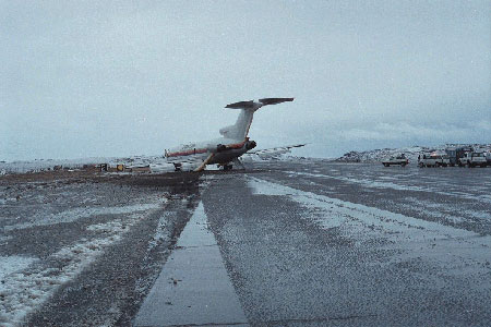 Le Boeing 727 immatriculé C-GXFA assurait le vol régulier 860 de First Air entre Ottawa (Ontario) et Iqaluit (Nunavut) avec, à son bord, 7 membres d'équipage et 52 passagers. L'aéroport d'Iqaluit essuyait les premières bourrasques de neige importantes de l'hiver et des opérations de déneigement étaient en cours. Le vent soufflait de l'est à approximativement 20 noeuds avec des rafales à 30 noeuds. Les véhicules de déneigement ont quitté la piste et se sont tenus à l'écart de cette dernière pendant que l'avion effectuait une approche aux instruments de la piste 35. En raison des vents forts, l'approche a été interrompue à environ 5 milles marins de l'aéroport et une seconde approche de la piste 35 a été entreprise. Après avoir touché le sol à proximité de l'axe de la piste, l'appareil est sorti de la piste sur la gauche, puis il est revenu sur la piste. Il a ensuite de nouveau dérivé sur la gauche et s'est finalement immobilisé à 7 000 pieds du seuil de la piste. Le train d'atterrissage avant et le train d'atterrissage principal gauche étaient sortis de la piste et reposaient dans la boue se trouvant à l'ouest de cette dernière. Une évacuation d'urgence a été ordonnée et tous les passagers ainsi que les membres d'équipage ont quitté l'appareil indemnes. L'appareil n'a subi que des dégâts mineurs.