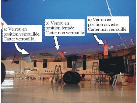 - verrous fermés, mais non verrouillés. Dans ce cas, les verrous dépassent d'environ un pouce sous les carters. Il s'agit de la position normale des verrous après l'ouverture des carters par le personnel de maintenance, et ce, jusqu'à ce que les verrous soient verrouillés de nouveau;