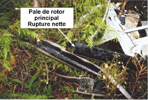 - Une des cinq pales du rotor principal de l'hélicoptère s'est rompue en vol au tiers de sa longueur, et une ou deux des autres pales du rotor principal ont heurté la poutre de queue et l'ont cisaillée en vol, ce qui a rendu l'hélicoptère impossible à maîtriser.