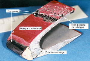 - La partie du revêtement de la pale du rotor principal qui s'est détachée présentait un manque d'adhérence, ce qui a provoqué la formation de piqûres de corrosion dans la pale. Une crique a pris naissance dans l'une des piqûres et s'est propagée, et la pale s'est rompue en fatigue. La présence de la crique dans la pale du rotor principal n'aurait pas pu être décelée grâce à une inspection visuelle avant le vol.