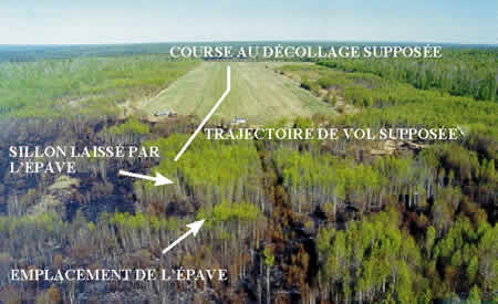 L'appareil a heurté des peupliers de seconde pousse d'une hauteur d'environ 30 pieds en un lieu qui, à l'origine, était la zone de prolongement dégagé de l'aérodrome. L'examen du sillon laissé par l'épave a permis d'établir que l'appareil était descendu dans les arbres en un piqué incliné à gauche extrêmement prononcé, qu'il avait rebondi au contact initial avec le sol et qu'il avait fait la roue avant de s'immobiliser en position verticale. L'épave a laissé un sillon long de 151 pieds.