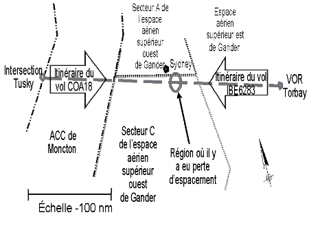 Deux avions étaient en palier au niveau de vol 350 (FL350) sur des routes inverses, à environ 23 milles marins (NM) au sud-est de Sydney (Nouvelle-Écosse). Le Boeing 767-400 assurant le vol 18 de Continental Airlines (COA18) en provenance de Newark (New Jersey), aux États-Unis, se dirigeait vers l'est à destination de Gatwick (Royaume-Uni). Le Boeing 767-300 assurant le vol 6283 d'Iberia Airlines (IBE6283) en provenance de Barcelone (Espagne) se dirigeait vers l'ouest, à destination de l'aéroport international John F. Kennedy, à New York (États-Unis). Lorsque les deux appareils n'étaient plus qu'à quelque 10 NM l'un de l'autre, ils ont du prendre des mesures en réponse à des avis de résolution du système d'avertissement de trafic et d'évitement d'abordage. COA18 est monté jusqu'au FL354 et IBE6283 est descendu jusqu'au FL335. Au moment où les deux appareils se sont croisés, l'espacement vertical entre eux était de 1900 pieds et l'espacement latéral d'environ 0,4 nm, dans une région où les espacements vertical et latéral requis sont respectivement de 1000 pieds et 5 nm.