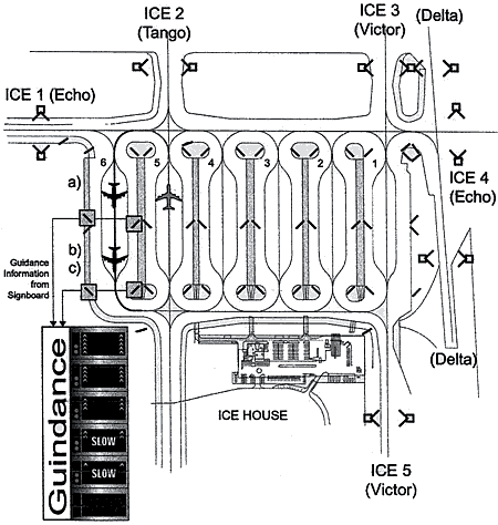 Un système de guidage automatisé est maintenant en place. Le système va réduire le nombre de communications radio VHF et éliminer le recours aux véhicules « follow me », réduisant par le fait même l'encombrement des voies de circulation au centre de dégivrage.