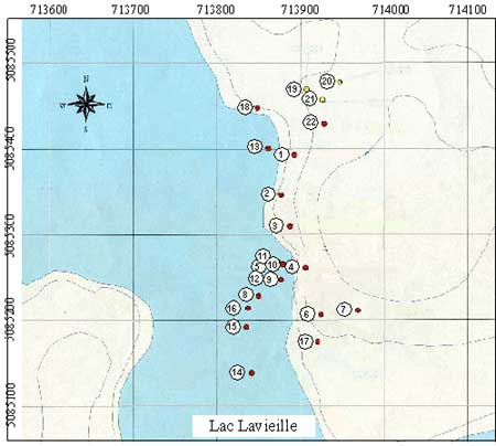Notes : De petits morceaux d'aluminium, de plastique, de plexiglass et de fibre de verre ont été retrouvés dans toute la zone boisée jonchée de débris délimitée par les repères terrestres. De gros morceaux de l'aile, des stabilisateurs et des commandes de vol ont été retrouvés dans l'eau, mais très peu de petits débris ont été découverts dans l'eau, sauf là où se trouvait l'épave principale.La zone à proximité des points 21 et 22 était jonchée de petits débris (petits morceaux d'aluminium, de plastique, de plexiglass et de fibre de verre, des morceaux de carte, un magazine et deux mitaines en éponge qui servaient d'obturateurs d'entrée d'air.