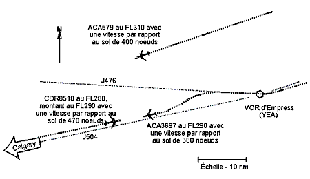 Quand ACA3697 reçoit l'autorisation de descendre, un Airbus A320 (ACA579) vole vers l'ouest au FL310, avec un cap de 252°, à environ 11 nm au nord de YEA. Après avoir établi le cap d'ACA579, le contrôleur d'Alsask donne à ACA3697 l'instruction de virer sur la gauche au 250°, puis, peu après, celle de virer sur la droite au 270°. Cette manoeuvre a pour objet de maintenir l'espacement entre ACA3697 et ACA579, mais elle place ACA3697 sur une trajectoire presque inverse de celle de CDR8510. ACA3697 se met en palier au FL290 à environ 5,9 nm en avant de CDR8510 qui passe au FL280 en montée vers le FL290.