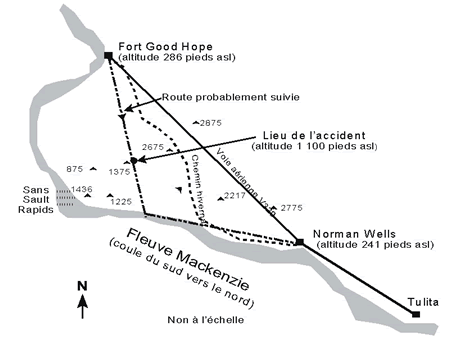 Pour se rendre de Norman Wells à Fort Good Hope par la voie des airs, il existe essentiellement trois grandes routes. La route directe suit la voie aérienne mais est assujettie, selon les règles de vol aux instruments (IFR), à une altitude minimale en route (MEA) de 5 300 pieds au-dessus du niveau de la mer (ASL). Tant la route qui survole le fleuve que celle qui survole le chemin hivernal se trouvent à l'ouest de la route directe (voir l'annexe A). Ces deux autres routes sont plus longues que la route directe, mais ce sont elles que les pilotes préfèrent lorsque les conditions météorologiques sont mauvaises, car le fleuve et le chemin simplifient la navigation. Le chemin hivernal emprunte des reliefs plus élevés que ceux rencontrés dans la vallée du fleuve, mais il offre davantage de surfaces d'atterrissage d'urgence. C'est la route survolant la vallée du fleuve qui traverse les reliefs les plus bas de toutes les routes; toutefois, en hiver, les pilotes sont souvent confrontés à des problèmes de mauvaise visibilité quand du brouillard recouvre la vallée aux abords des eaux libres à Sans Sault Rapids.