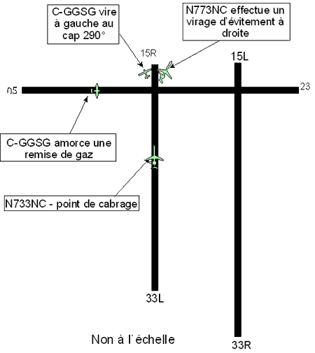 Ne sachant pas que le pilote du Cessna 206 avait un problème de train d'atterrissage, et croyant que le Cessna s'était déjà posé et terminait sa course à l'atterrissage, le contrôleur lui a donné des instructions de circulation au sol et lui a répété l'instruction de se tenir à l'écart de la piste 33L. Alors qu'il ne restait que 3 350 pieds de piste avant l'intersection de la piste 33L, le pilote du Cessna a amorcé une remise des gaz et a aussitôt avisé le contrôleur. Les deux avions se dirigeaient alors tous les deux vers l'intersection des deux pistes. Le contrôleur a immédiatement demandé au pilote du Cessna d'amorcer un virage à gauche. Cependant, il n'a pas avisé le pilote de la situation conflictuelle et il ne lui a pas demandé de se tenir à l'écart de la piste 33L.