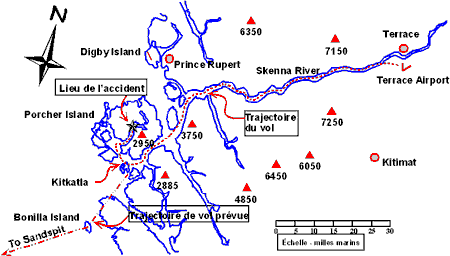 Le pilote a dévié de sa route prévue au plan de vol entre l'embouchure de la rivière Skeena et la station de phare de l'île Bonilla. Sa nouvelle trajectoire déviait à l'ouest de celle prévue au plan de vol, ce qui l'a amené à survoler le village de Kitkatla, puis à suivre l'anse de Kitkatla vers le nord-ouest et, finalement, à voler vers le nord jusqu'au lieu de l'accident, près du centre de l'anse de Porcher.
