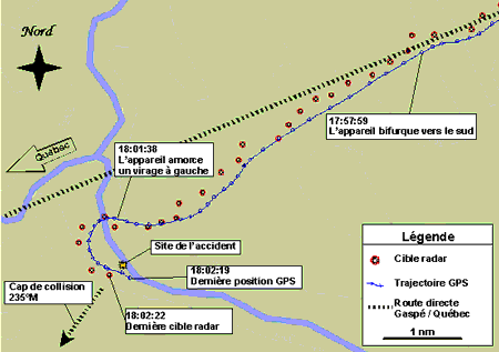 L'appareil a suivi la route directe entre Gaspé et Québec en maintenant à quelque 100 pieds près, une altitude de 5000 pieds, à une vitesse sol relativement constante de 95 noeuds. À 17 h 58, à 130 nm de Gaspé et à 170 nm de Québec, l'avion a bifurqué légèrement vers le sud de sa route. Une minute plus tard, l'appareil a accentué un peu plus son cap vers le sud. Il a ensuite amorcé un virage à droite sur un cap d'interception avec la route directe vers Québec. À 18 h 1, il a amorcé un virage d'environ 20° sur la gauche. Pendant le virage, l'altitude de l'avion a chuté de 5000 pieds asl à 4600 pieds asl, et la vitesse sol a augmenté de 93 noeuds à 159 noeuds en 30 secondes. Dix secondes plus tard, le GPS a cessé d'enregistrer la trajectoire de l'avion à l'altitude de 4739 pieds sur un cap au 138°M. Au même moment, le radar a cessé de capter les retours du transpondeur, et l'écho de l'appareil (secondaire et primaire) a disparu de l'écran. La dernière position enregistrée se trouve à moins de 200 mètres du site de l'accident. (Voir Figure 1).