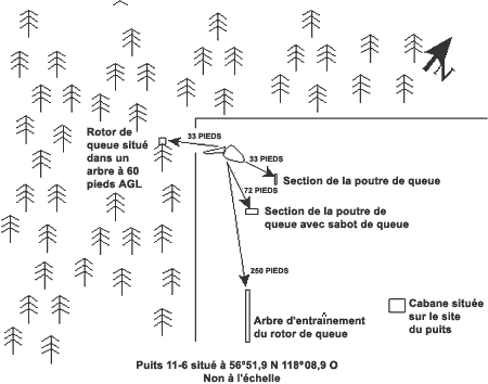 L'hélicoptère s'est écrasé dans le coin nord-ouest d'un terrain sur lequel se trouvait un puits. Plusieurs arbres ont été étêtés. Le rotor de queue presque intact et une section de 2 pieds de longueur du cône de queue de l'hélicoptère ont été retrouvés dans un arbre d'environ 60 pieds de hauteur situé à 35 pieds derrière l'épave. Le reste de l'épave reposait à l'endroit devant cet arbre au bord du terrain où se trouve le puits. La partie comportant le moteur était plus enfoncée dans le sol que la cabine. La partie inférieure du sabot de queue a été retrouvée à environ 40 pieds en avant et à droite de l'épave principale (à environ 45°). La partie avant de la poutre de queue présentait deux marques d'impact faites par le rotor principal. Le bord d'attaque de chaque pale du rotor principal était déformé et présentait des résidus de peinture provenant de la poutre de queue. La majeure partie du pare-brise/verrière a éclaté en plusieurs morceaux qui se sont retrouvés à l'avant de la cabine. La partie de la poutre de queue qui comportait le feu anti-collision a été heurtée par une pale du rotor principal et a été retrouvée à environ 50 pieds devant la cabine. L'arbre d'entraînement du rotor de queue reposait à environ 150 pieds à droite de l'épave (voir l'annexe A).