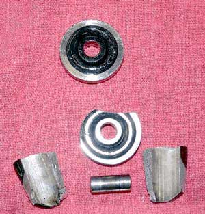 On a déposé le carter avant du moteur et on a constaté que le galet de came de la soupape d'échappement du cylindre no 3 était excessivement usé. La partie supérieure du guide de galet de came à rainure était fendue et brisée. On a mesuré le galet de came et on a constaté qu'il était usé de 0,249 pouce et qu'il présentait un méplat sur un côté (voir l'annexe A). On a inspecté la couronne à cames et on a découvert que les quatre bossages d'échappement étaient excessivement usés et hors limites. On a inspecté la tige poussoir de la soupape d'échappement du cylindre no 3 et on a déposé les rotules d'embout pour vérifier le nombre de rondelles d'espacement placées sous les rotules. On peut allonger ou raccourcir la portée des tiges poussoirs en ajoutant des rondelles d'espacement sous les rotules d'embout de manière à régler le jeu des soupapes au moment d'une révision générale ou du remplacement d'un cylindre. Il y avait deux rondelles d'espacement à l'une des extrémités, et une seule à l'extrémité opposée. Toutefois, la rondelle d'espacement unique avait été installée en position verticale et avait été repliée de force à angle droit.