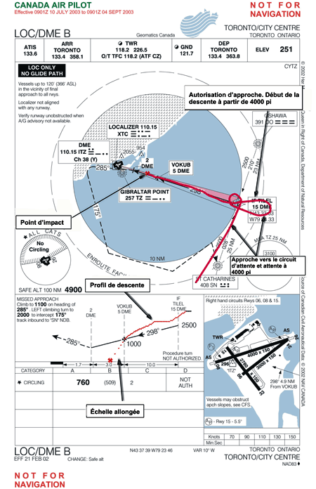 L'ACVT dispose aussi d'une approche de précision ILS/DMENote de bas de page 6 pour la piste 08. Un conflit d'espace aérien exclut l'utilisation de cette approche lorsque les piste 23 et 24 sont en service à l'aéroport international de Toronto/Lester B. Pearson. Par conséquent, les approches ILS/DME de la piste 08 ne sont autorisées que lorsque l'aéroport international de Toronto/Lester B. Pearson utilise les pistes 05 et 06. Il s'ensuit que l'approche de précision ILS n'a pas été offerte à N6058T. N6058T a accepté l'approche LOC/DME B sans demander ni indiquer de quelque façon une préférence pour une autre approche.