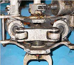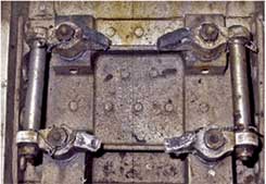 Le dispositif d'orientation du train avant (photo 1) comprend une ferrure de fixation supérieure et inférieure, un vérin de commande gauche et droit et un arbre muni d'un joint universel qui s'accouple au train avant. Les ferrures sont fixées ensemble à quatre endroits au moyen de boulons, d'écrous et d'une cale, cette dernière servant à maintenir l'espacement. Tout le dispositif d'orientation est ensuite fixé par des boulons à la cloison arrière du logement du train avant de l'avion. On a remarqué des signes d'usure de contactNote de bas de page 2 sur les surfaces de contact des ferrures supérieure et inférieure au niveau de la fixation à la cloison (photo 2). Les surfaces de rupture de la ferrure supérieure étaient lourdement contaminées par du liquide hydraulique Skydrol® noirci et leur fini avait une apparence polie. De plus, la peinture à proximité des surfaces de rupture était amollie et comportait des boursouflures, un peu comme une couche de peinture sur laquelle on aurait appliqué un liquide décapant. Par comparaison, les surfaces de rupture de la ferrure inférieure étaient propres et mates, et la peinture ne présentait aucun signe d'amollissement ni aucune boursouflure. Les surfaces de rupture des ferrures supérieure et inférieure présentaient des signes d'arrachement du métal sous l'effet de l'impact des surfaces de rupture l'une sur l'autre. L'ensemble du dispositif d'orientation du train avant a été envoyé au Laboratoire technique du Bureau de la sécurité des transports (BST) pour y être examiné plus en détail.