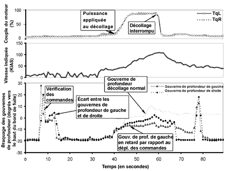 - Au début de la course au décollage, les bords de fuite des deux gouvernes de profondeur ont été abaissés en même temps d'environ 7,5°, alors que l'appareil avançait à une vitesse indiquée en noeuds (KIAS) de 45. À mesure que l'appareil a accéléré, un écart s'est créé du fait que la gouverne de profondeur de gauche n'a pratiquement pas bougé, alors que le bord de fuite de celle de droite a continué à se relever jusqu'à un maximum de 2,2°. L'écart maximal était de 8° à 107 KIAS.