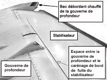 - De la glace peut s'être trouvée dans l'espace entre la gouverne de profondeur et le carénage, au bord de fuite du stabilisateur. Des événements antérieurs ont démontré que des traces de contaminant à cet endroit pouvaient nuire au déplacement de la gouverne de profondeur en restant coincées entre la gouverne de profondeur et le carénage. On a identifié la formation de glace à cet endroit comme la source de gêne la plus plausible ayant pu causer cet événement.