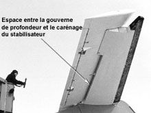Étant donné le déplacement d'abord libre de la gouverne de profondeur, la nature éphémère de la gêne et l'absence de contaminant à cet endroit au moment de l'inspection effectuée après l'événement, on a considéré peu probable que le contaminant ait été gelé à un endroit fixe dans l'espace en cause. Il semble plutôt qu'un fragment de glace flottait dans le liquide d'antigivrage qui se trouvait sur la gouverne de profondeur de gauche. Pendant la vérification des commandes, ce fragment s'est probablement logé dans l'espace entre la gouverne de profondeur et le carénage, au bord de fuite du stabilisateur, et a donné lieu à l'écart qu'a enregistré le FDR entre la position de la gouverne de profondeur de gauche et celle de la gouverne de profondeur de droite pendant la vérification des commandes latérales. Le fragment de glace n'avait pas à être très gros; comme le montre la figure 1, l'espacement entre le carénage et la gouverne de profondeur n'est que de 0,15 à 0,25 pouce. Étant donné la pluie verglaçante qui était tombée au cours de l'approche précédente et pendant que l'appareil se trouvait au sol entre les vols, il s'agissait probablement de glace transparente, laquelle avait échappé à la détection visuelle pendant le dégivrage. Pendant la vérification des commandes, lorsque le bord de fuite de la gouverne de profondeur a été déplacé de sa position abaissée (position verrouillée avant ce point du vol, comme le montrent les photos 1 et 2) à sa position relevée (comme le montre la photo 3), il est probable que la glace s'est déplacée vers l'avant pour aller se loger entre la gouverne de profondeur et le carénage. Lorsque le pilote a vérifié les commandes latérales, la gouverne de profondeur se trouvait presque à la position neutre, maintenue sans dispositif de retenue ou de verrouillage par son propre poids et les rafales, sans déplacement intentionnel. Dans ces conditions, le pilote ne pouvait sentir l'écart de position entre les gouvernes de profondeur. Il n'y a aucune indication dans le poste de pilotage quant à la position des gouvernes de profondeur ou aux écarts entre ces dernières.