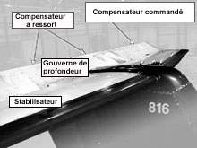 - Il se peut que le déplacement du compensateur à ressort de la gouverne de profondeur de gauche ait été limité par de la neige, de la glace ou des résidus gelés de liquide d'antigivrage réhydraté. Cette hypothèse a été écartée, car le FDR avait déjà démontré qu'il y avait eu un écart dans le déplacement des gouvernes de profondeur pendant la vérification des commandes, à la vitesse de circulation au sol, laquelle n'est pas assez élevée pour que le compensateur ait un effet significatif, et les inspections effectuées après l'événement n'ont permis de déceler aucune trace de contaminant.