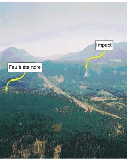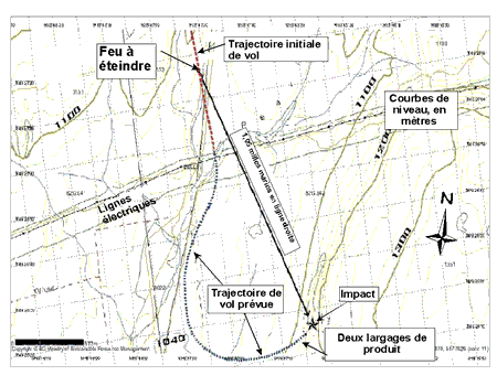 L'avion pointeur a rejoint Tanker 86 et l'a suivi dans le secteur arrière gauche lorsque l'avion-citerne a survolé le site de largage. Après que l'Electra a largué la charge de produit spécifiée, à 12 h 20 HNR, l'avion pointeur a amorcé un virage à droite pour tourner en rond au-dessus de la zone d'incendie, afin de permettre aux agents de lutte aérienne qui se trouvaient du côté droit de l'appareil d'évaluer le largage. Au même moment, et comme l'Electra passait au-dessus des lignes électriques, le pilote aux commandes de l'avion pointeur a indiqué par radio que l'avion effectuait un virage à droite. On a vu l'avion-citerne virer d'abord à droite, puis à gauche. Quelque 50 secondes plus tard, on a vu Tanker 86 dans une inclinaison extrême à gauche, juste avant qu'il ne heurte la crête et n'explose (figure 1).