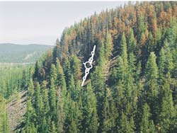La région environnante est plus densément peuplée d'arbres, lesquels ont tendance à dissimuler le bourrelet périphérique et l'affleurement rocheux que l'appareil a heurté. Le relief voisin de la trajectoire de vol initiale s'élève lentement vers l'est et inclut la crête se trouvant sur les lieux de l'accident, ainsi que la route de sortie qui suit la vallée vers le sud et le lac Moyie (photo 3). Cette région comportait un espace de manoeuvre suffisant au-dessus d'un relief relativement plat. La crête qu'a heurtée l'appareil se fondait au relief ascendant et elle ne se distinguait pas du relief avoisinant.