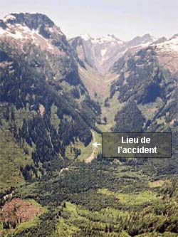 L'altitude des sommets montagneux situés à proximité des lieux de l'accident varie de 6400 à 7400 pieds au-dessus du niveau de la mer (asl), et il y avait de la neige en altitude, en particulier sur les versants faisant face au nord. L'épave a été retrouvée à environ 2100 pieds asl sur un versant faisant face au nord-ouest, à la jonction de deux vallées glaciaires en U : la vallée du ruisseau Tretheway et une vallée sans nom, un peu plus étroite. L'épave se trouvait à environ 1000 pieds au sud et 300 pieds au-dessus du ruisseau Tretheway. Dans la région immédiate entourant les lieux de l'accident, le contrefort montagneux était recouvert d'une végétation rase de couleur vert clair que l'on trouve habituellement dans les couloirs d'avalanche subalpins; ailleurs dans la région, la végétation prédominante était constituée d'une forêt de conifères foncés.