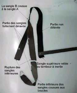 - Les bretelles de la ceinture de sécurité du pilote se sont rompues à une tension inférieure aux exigences réglementaires. Cette rupture est survenue à la suite d'une dégradation des sangles causée par une exposition prolongée à la lumière solaire.