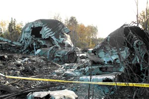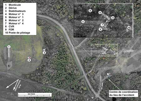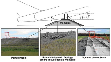 Les premiers dommages à l'aéronef sont survenus à la rotation lorsque la partie inférieure du fuselage arrière de l'avion est entré en contact avec la piste à deux reprises et que l'avion a poursuivi sa course au sol jusqu'à un point situé à 825 pieds au-delà de l'extrémité de la piste 24. L'avion a subi de lourds dommages lorsque la partie inférieure du fuselage arrière a percuté le monticule. La dérive et les deux stabilisateurs se sont alors détachés du fuselage. L'impact final s'est produit dans une zone boisée. Le violent incendie qui s'est déclaré après l'accident a détruit le reste de la structure en avant de la cloison étanche arrière de l'avion (Photo 1).