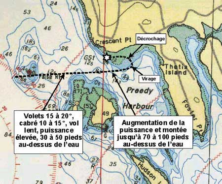 L'appareil est en vol lent à puissance moteur élevée; les volets sont sortis de 15 à 20 degrés et l'appareil est cabré de 10 à 15 degrés. Pendant la première phase du survol, on estime que l'appareil vole à une altitude de 30 à 50 pieds au-dessus de la surface de l'eau. À mesure que l'appareil s'approche de l'île de Thetis, le son du moteur s'intensifie et l'appareil commence à monter en cabré prononcé jusqu'à ce qu'il atteigne 70 à 100 pieds au-dessus de la surface de l'eau. L'appareil s'incline ensuite brusquement à gauche et le nez bascule subitement dans un piqué prononcé. Il n'y a aucun rétablissement consécutif à cette descente et l'appareil heurte la surface de l'eau en piqué, l'aile gauche basse. Le pilote subit des blessures mortelles à l'impact; quant au passager, il évacue l'appareil par la fenêtre arrière gauche avant d'être sauvé des eaux par des plaisanciers qui se trouvent à proximité. L'accident survient à 10 h 19.