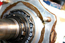 Pendant le remontage de la boîte de transmission, le boîtier de roulement de l'arbre creux d'entrée a été mal monté. Il était décalé de 90° dans le sens horaire par rapport aux orifices de lubrification d'entrée et de sortie de la boîte de transmission. Ce décalage a contribué à bloquer le passage de l'huile vers les roulements et a causé la défaillance catastrophique des roulements de l'arbre creux d'entrée. Ce type de défaillance appelée « désalignement » se produit quand les roulements saisissent alors que la cage de roulement se déforme