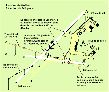 À 9 h 34 min 34 s, un Cessna Citation qui se trouvait sur l'aire de stationnement a communiqué avec le contrôleur sol de Québec. L'intensité de la communication était faible, et le pilote était pratiquement inaudible. Afin d'améliorer la qualité de la réception, le contrôleur a désactivé le bouton de communication de la fréquence air. Il a alors constaté que le Cessna 172 avait amorcé sa course au décollage sans autorisation et qu'il se trouvait par le travers de la voie de circulation Bravo. Immédiatement après, le contrôleur a ordonné à deux reprises à l'équipage du vol ACA513, qui roulait à 58 noeuds par le travers de la voie de circulation Alpha, d'interrompre le décollage. Après s'être rendu compte que l'Airbus A320 ne ralentissait pas, il a demandé à trois reprises au pilote du Cessna 172 d'amorcer immédiatement un virage à gauche. Les communications avec le vol ACA513 et le Cessna 172 ne pouvaient être entendues sur la fréquence air parce que le contrôleur avait désactivé le bouton d'émission de fréquence air.