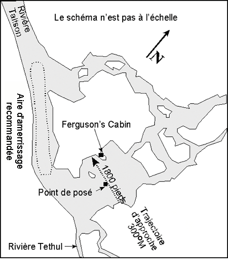 Ferguson's Cabin se trouve sur une baie au confluent de trois rivières (voir l'annexe A). Cette baie est entourée d'arbres et d'un rivage rocailleux en pente. Comme le pilote ne s'était encore jamais posé à cet endroit auparavant, les pilotes de l'entreprise s'étaient assurés que, avant de partir, leur collègue était au courant des caractéristiques de l'endroit et des éventuelles complications, et il avait reçu une carte de la baie dessinée à la main. À l'arrivée à Ferguson's Cabin comme au départ, la façon normale de procéder consiste à amerrir et à décoller en utilisant une partie rectiligne du chenal principal de la rivière, à l'ouest de la baie, manoeuvre suivie ou précédée d'une circulation sur l'eau vers ou depuis le lieu de villégiature; il s'agit là de la meilleure façon, et peut-être de la seule, de s'assurer de disposer d'une distance suffisante à l'amerrissage et au décollage. Amerrir directement dans la baie ou en décoller n'était pas conseillé, compte tenu des dimensions limitées de l'endroit et de l'existence d'un fort courant traversier à certains endroits de la baie. Deux jours après les faits, les enquêteurs ont constaté que le courant de la rivière était minimal au centre de la baie, là où l'on pense que l'accident s'est produit.