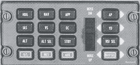 L'avion est équipé d'un système de commandes automatiques de vol (AFCS) Sperry SPZ-8000. Un seul contrôleur de vol (voir figure 1) est utilisé pour permettre la sélection de modes de fonctionnement et pour embrayer/débrayer le pilote automatique. La plupart des commandes du contrôleur de l'AFCS sont des boutons-poussoirs à double effet (pousser pour ON, pousser pour OFF). Deux modes verticaux sont offerts. Le bouton IAS, une fois actionné, capte et maintient la vitesse indiquée de l'avion. Le bouton de vitesse verticale (VS), une fois actionné, capte et maintient la vitesse verticale de l'avion. Lorsque le mode VS est utilisé, la vitesse n'est pas contrôlée par l'AFCS.