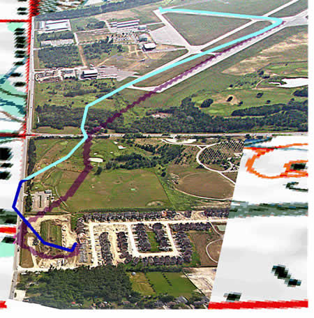 L'avion s'est écrasé sur un monticule de terre situé derrière les fondations d'une habitation résidentielle en construction. L'avion était orienté vers l'est et incliné de quelque 20 degrés à gauche (toutes les mesures sont approximatives). Le côté gauche de la coque en fibre de verre a heurté un coffre d'égout en béton qui dépassait du monticule. L'avion s'est immobilisé brusquement et a plongé dans l'espace vide entre deux monticules de terre. Le poste de pilotage s'est immobilisé en position presque verticale en piqué. L'arrière du fuselage s'est déformé au point de dépasser la verticale. Il y avait une distance de 15 pieds environ entre le début de la trace au sol et le nez de l'avion. Au-delà du deuxième monticule se trouvait une chaussée exempte d'obstacles sur 400 pieds de longueur, et plus loin, un champ d'exercice de 2000 pieds et un terrain de golf.