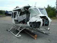 L'hélicoptère s'est immobilisé sur le dos à environ 1000 pieds de la rive dans à peu près 25 pieds d'eau et de limon, ce qui a totalement obscurci l'eau pendant les opérations de repêchage. On a d'abord tenté de sortir l'hélicoptère de l'eau en le tirant par le crochet de charge, mais la poutre de force s'est arrachée et n'a pas été retrouvée. Le réservoir d'eau, le rotor de queue et toutes les pièces qui s'étaient détachées de la cellule n'ont pu être récupérées à cause de la faible visibilité sous l'eau. Une fois la cellule récupérée, l'examen de la cellule a confirmé que l'hélicoptère avait heurté la surface de l'eau en piqué sur le côté droit (Photo 1).