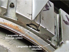 Le disque du premier étage du compresseur axial compte 31 aubes (réf. 1-100-361-06). Chaque aube est assujettie par une languette de blocage (réf. 1-100-505-02). Ces languettes sont à usage unique et elles doivent être remplacées à chaque démontage. L'examen a montré que toutes les languettes de blocage, qui retenaient les aubes au disque du premier étage du compresseur axial, étaient dépliées (Photo 2). Toutes les aubes avaient reculé, et il y avait des rayures de rotation à la base des aubes arrière ainsi que des dommages correspondants sur la périphérie avant du support des ailettes fixes.