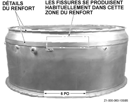 - Une inspection visuelle extérieure de la zone critique du carter de la chambre de combustion pour déceler des soudures de réparation. Si une soudure de réparation est découverte, la fréquence de l'inspection devient quotidienne jusqu'à ce que le carter de chambre de combustion soit remplacé par un carter sans soudures.