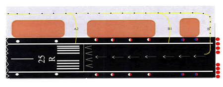 - L'axe des voies de circulation B1 et A2 s'incurve sur la bande latérale de la piste. La nuit, il se pourrait que les pilotes alignent leur avion sur la bande latérale de piste plutôt que sur l'axe de piste.