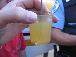 L'examen de l'avion sur le site de l'accident a permis de récupérer initialement quelques gouttelettes d'eau par le purgeur du réservoir carburant de l'aile droite. Aucune purge n'a pu être effectuée au réservoir gauche dû au froissement de la tôle de l'aile qui obstruait l'accès au purgeur. Une purge du récipient du filtre à carburant, situé dans le compartiment moteur, a permis de constater qu'il contenait 5 à 6 onces d'eau jaunâtre (voir photo 1).