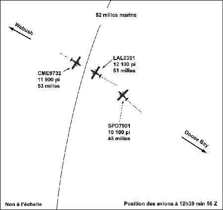 À 12 h 25 min 31, temps universel coordonné (UTC)Note de bas de page 1, Labair 8301 (LAL8301) a décollé de Goose Bay en direction de Wabush. On lui a assigné un cap de 290° magnétiques (M) et on l'a autorisé à monter jusqu'à 12 000 pieds (pi). À 12 h 26 min 26, Speedair 7901 (SPD7901), un Saab 340, a signalé qu'il venait de décoller de la piste 26 de Goose Bay en direction lui aussi de Wabush, qu'il maintenait le cap de la piste (259 °M) et qu'il montait au niveau de vol (FL) 200. L'espacement réglementaire utilisé pour le départ était conforme l'article 531.2A du Manuel d'exploitation du contrôle de la circulation aérienne (MANOPS ATC) de NAV CANADA utilisé par les Forces canadiennes. Les avions ont été identifiés au radar après le décollage à moins de 1 nm de l'extrémité de la piste. L'espacement radar a été établi à partir de ce point en demandant à SPD7901 de maintenir le cap de la piste, qui était différent de la trajectoire de LAL8301. L'espacement radar requis dans la région de contrôle terminal de Goose Bay est de 3 nm. Cet espacement a été établi et maintenu entre LAL8301 et SPD7901 pendant leur montée en direction de Wabush.