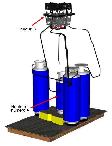 L'aérostier a ensuite raccordé au brûleur C la conduite de la bouteille numéro 4 (15 gallons), laquelle avait été installée par l'aérostier pour fournir du propane supplémentaire en vue du vol prévu, il a ouvert le robinet du réservoir, vérifié l'absence de fuites dans la conduite ainsi que dans les raccords et allumé la veilleuse. Il a ensuite procédé à un essai de combustion en tirant sur le déclencheur de la vanne de commande pour vérifier si le brûleur fonctionnait. L'aérostier et l'équipier au sol ont alors entendu un claquement, rapidement suivi d'un sifflement, puis immédiatement d'un très fort bruit et d'un violent incendie. La conduite de propane est partie dans tous les sens. L'aérostier a immédiatement été brûlé. Il a ordonné aux passagers d'évacuer la nacelle, puis il a lui-même évacué. Il n'a cependant pas actionné le système de dégonflage d'urgence.