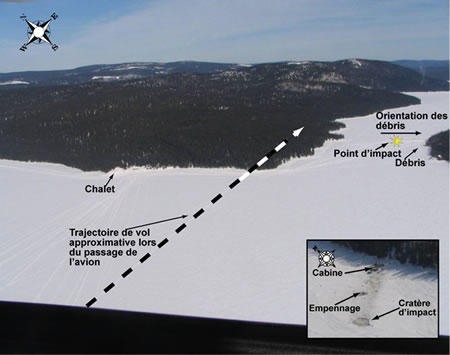 Au-dessus de la rive nord de la baie, l'appareil amorce une légère remontée suivi d'une forte inclinaison avant de disparaître derrière les arbres. L'appareil suit plus ou moins la rive ouest du lac en éloignement du chalet. Un bruit d'impact retentit dans les secondes qui suivent. Quelques minutes plus tard, l'appareil est retrouvé disloqué sur la surface gelée du lac.