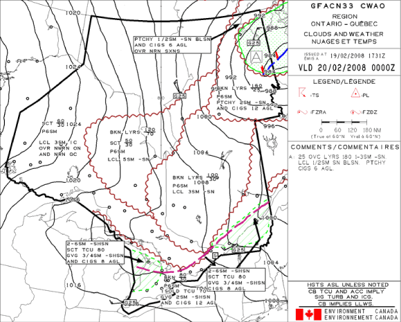 Message « Echo » : conditions météorologiques à 3 h Z : vent du 250° à 12 nœuds, visibilité de 10 milles dans des averses de neige, nuages épars à 5400 pieds, nuages épars à 8000 pieds, nuages épars à 11000 pieds, température de −8 °C, point de rosée de −11 °C, calage altimétrique de 29,93 pouces de mercure.