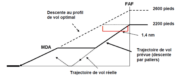 Les approches par paliers sont uniquement fondées sur un profil de franchissement d'obstacles, et elles ne sont pas idéales pour les avions à réaction modernes utilisés dans l'aviation commerciale. L'utilisation d'un profil d'approche SCDA :