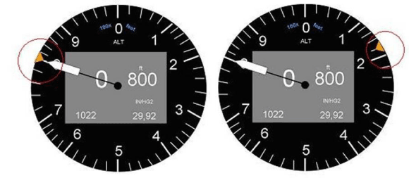 L'aiguille d'altitude blanche indique l'altitude, donnée par tranches de cent pieds, elles-mêmes subdivisées par tranche de vingt pieds, et chaque tour d'aiguille équivaut à mille pieds d'altitude. La position de l'aiguille blanche par rapport au curseur orange permet de déterminer si l'avion s'approche d'une altitude critique comme la MDA. Par contre, pour utiliser ce type de curseur d'altitude, l'équipage doit être au courant de l'altitude, plus particulièrement pour les altitudes cibles de plus de 1000 pieds asl.
